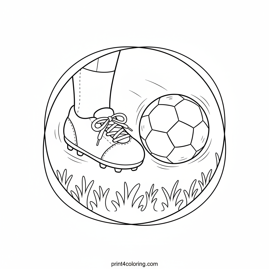 Capture the excitement of a soccer game! This dynamic coloring page freezes the moment a player's foot connects with the ball. Focus on the intricate details of the textured cleat, the classic soccer ball deforming from impact, and the individual blades of grass. A powerful sports scene awaits your colors!
