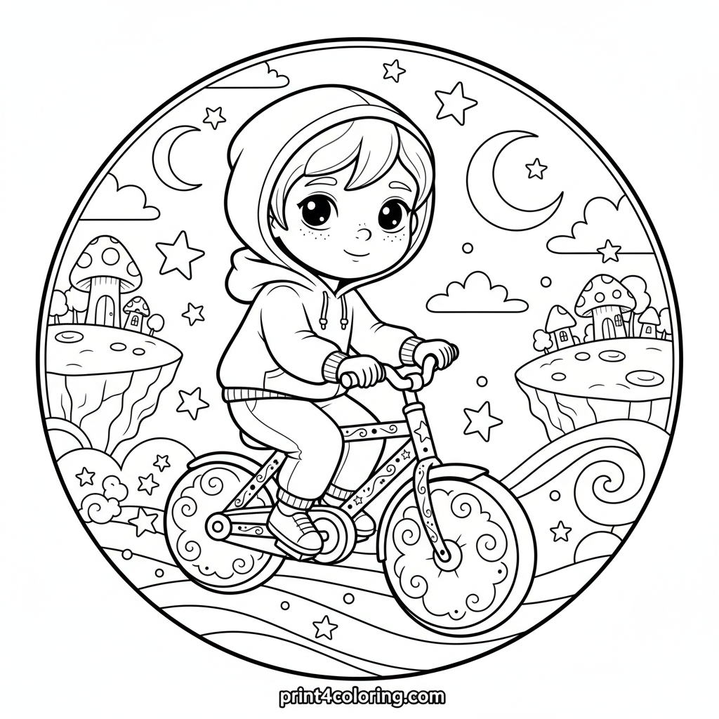 #sky-rider#cloud-bicycle#fantasy#adventure#whimsical#stars#moon#floating-islands#child-adventure#coloring-page#printable