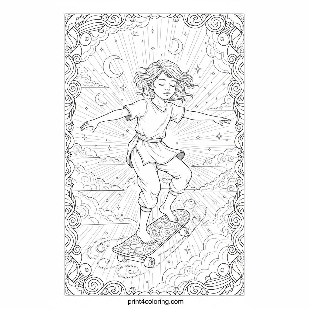 Imagine soaring high above the world! This magical coloring page features a child gracefully gliding on a finely detailed skateboard along a path of shimmering stardust and soft clouds. A peaceful landscape unfolds below, while tiny sparkling trails follow the wheels. Bring this dreamlike scene to life with your most vibrant colors!