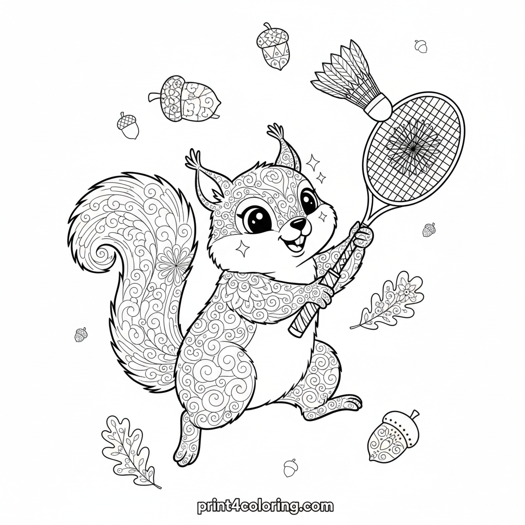 Get ready for action! This adorable, fluffy squirrel with sparkling eyes is poised to make an epic 'smash' with a racket almost its size. A shuttlecock hovers playfully. Detailed leaves and acorns decorate the background, creating a challenging and fun forest scene perfect for your vibrant colors!