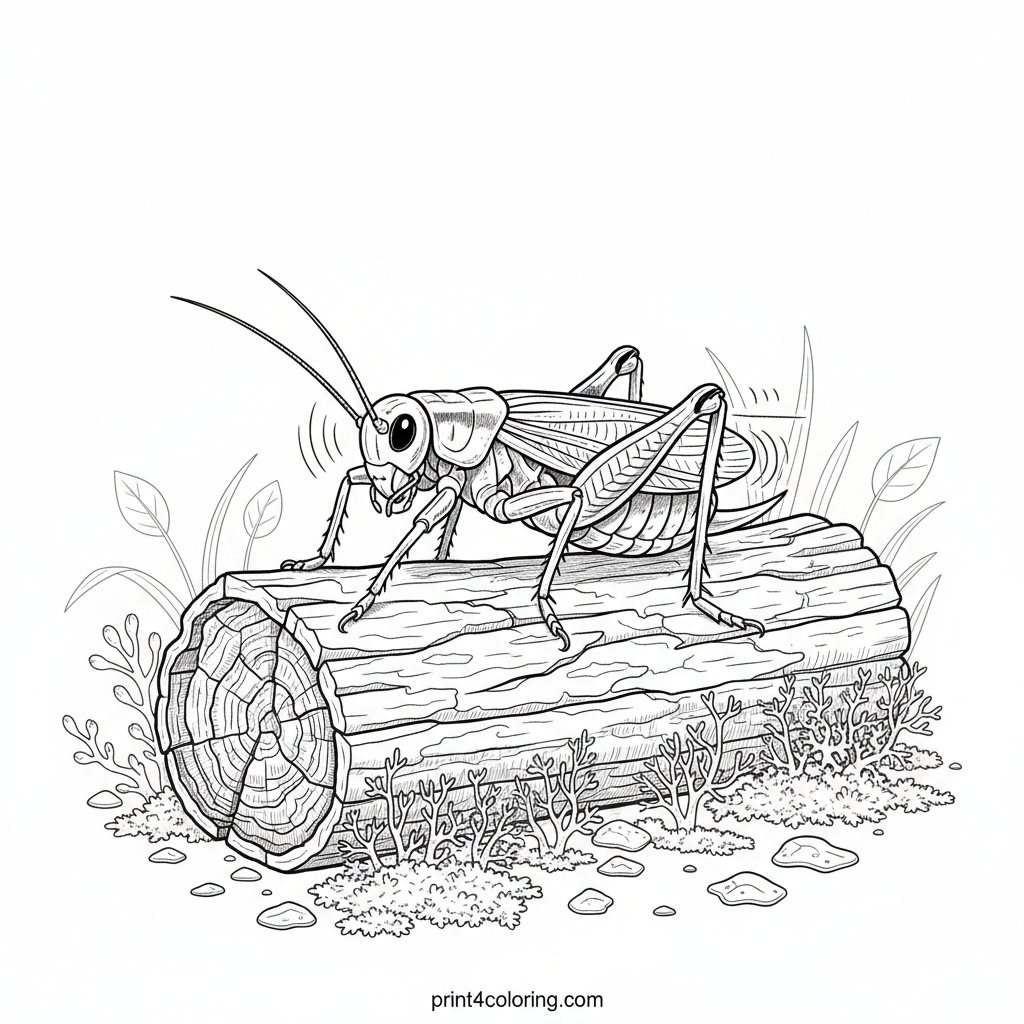 Immerse yourself in the enchanting world of a robust cricket, caught mid-song under the twilight sky. Its wings are a blur of motion, perched on ancient, textured tree bark adorned with intricate moss and delicate lichen. Bring this musical moment to life with your most vibrant colors and detailed shading.