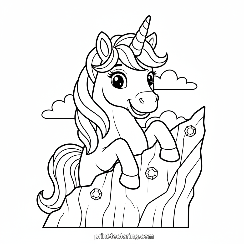 Watch a magnificent unicorn with a gentle smile as it gracefully climbs a dazzling rainbow cliff. Its hooves sparkle, finding secure holds among glittering gems. This magical scene invites you to add your favorite colors to bring the unicorn and its vibrant, sparkling journey to life.