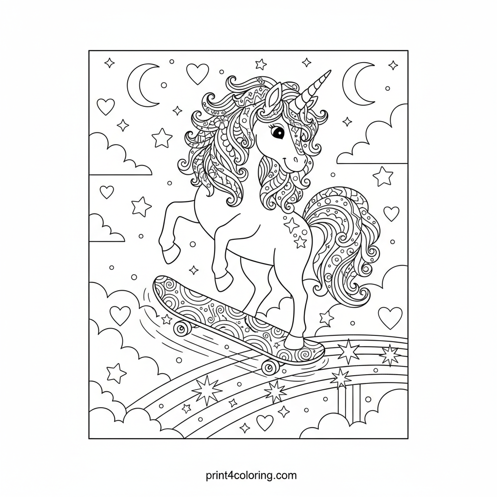 Soar through a star-dusted sky with a majestic unicorn showcasing incredible skateboarding skills! Its flowing mane and tail shimmer as it gracefully grinds a dazzling rainbow rail. Adorn its skateboard with vibrant colors and bring this fantastical, star-dusted adventure to life!