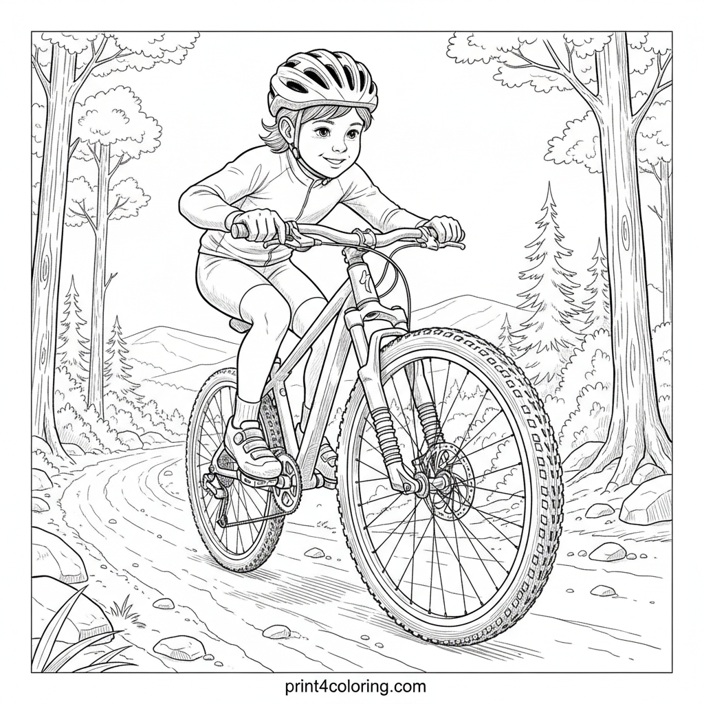 Join a determined young cyclist as they conquer a challenging mountain trail! This detailed scene features a rider vigorously pedaling up a winding dirt path, surrounded by realistic forest trees with textured bark. Distant, softly sketched hills under a bright sky complete this exciting outdoor adventure, perfect for experienced colorists.