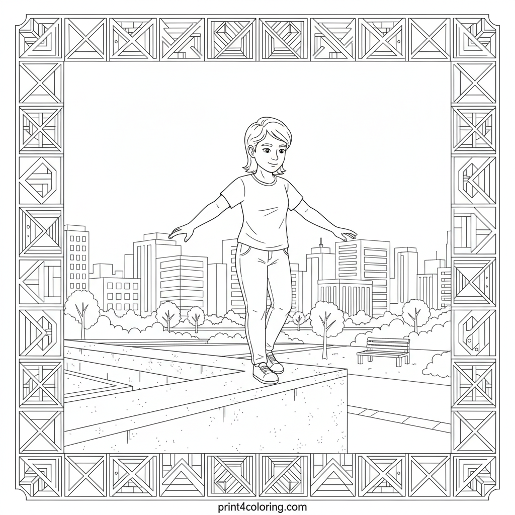 Witness a young architect's incredible balance on this expert coloring page! Navigate a detailed urban landscape as an athletic individual gracefully moves across geometric structures. Color the modern cityscape, textured concrete, and green park spaces, bringing this scene of precision and urban harmony to vibrant life with your artistic touch.