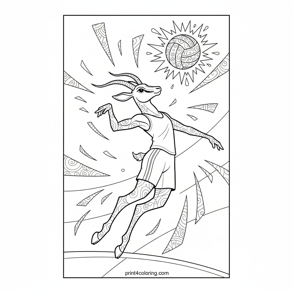 Witness the thrilling moment a graceful athlete launches into a powerful volleyball spike! This dynamic scene captures the figure mid-air, with a geometrically patterned ball radiating speed lines. Abstract energy bursts in the background amplify the excitement, inviting you to add vibrant colors to this high-action sports spectacle.