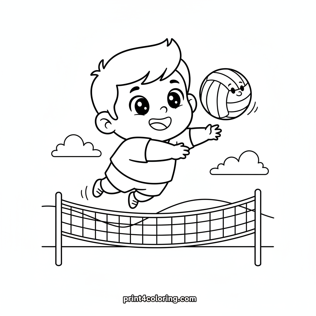 Get ready for action with this super cute coloring page! Watch a cheerful cartoon child character soar through the air, ready to deliver an amazing volleyball spike. With a happy and determined expression, they're mid-jump, arms extended over the net. Perfect for sports fans and aspiring athletes!