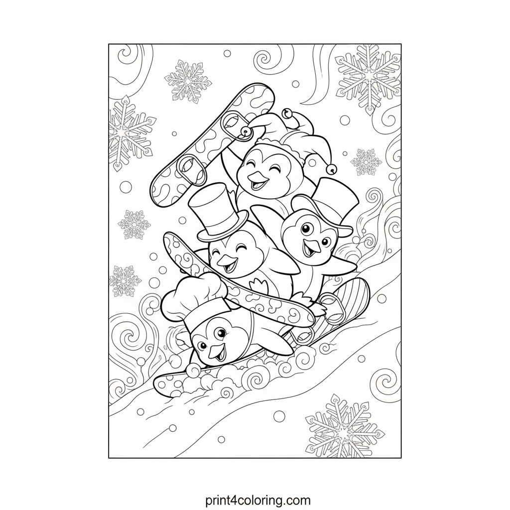 Get ready for a flurry of fun with these playful penguins! They're hitting the slopes in style, sporting the silliest hats imaginable while attempting to snowboard. Watch them tumble and pile up in a hilarious action pose, surrounded by intricate snowflakes and cool zentangle patterns. Grab your colors and bring this frosty fiesta to life!