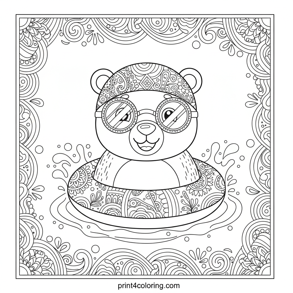 Dive into fun with our whimsical bear! He's sporting a comically oversized, patterned swim cap and stylish goggles, joyfully floating on an intricately designed inner tube in a sparkling pool. Surrounded by playful splash patterns, this detailed scene is perfect for bringing a vibrant, sunny day to life!