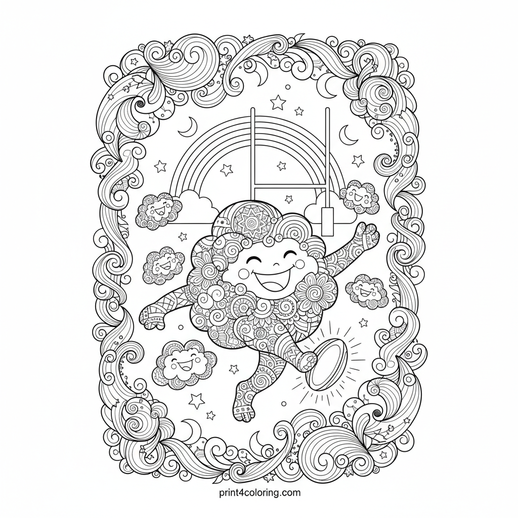 Soar into a fantastical sky match where whimsical cloud-creatures, adorned with intricate patterns, play aerial rugby! Watch as one gracefully kicks a glowing ball towards a shimmering rainbow goal, while friends cheer amidst a swirling, patterned sky. This hard-difficulty page is perfect for detailed coloring.