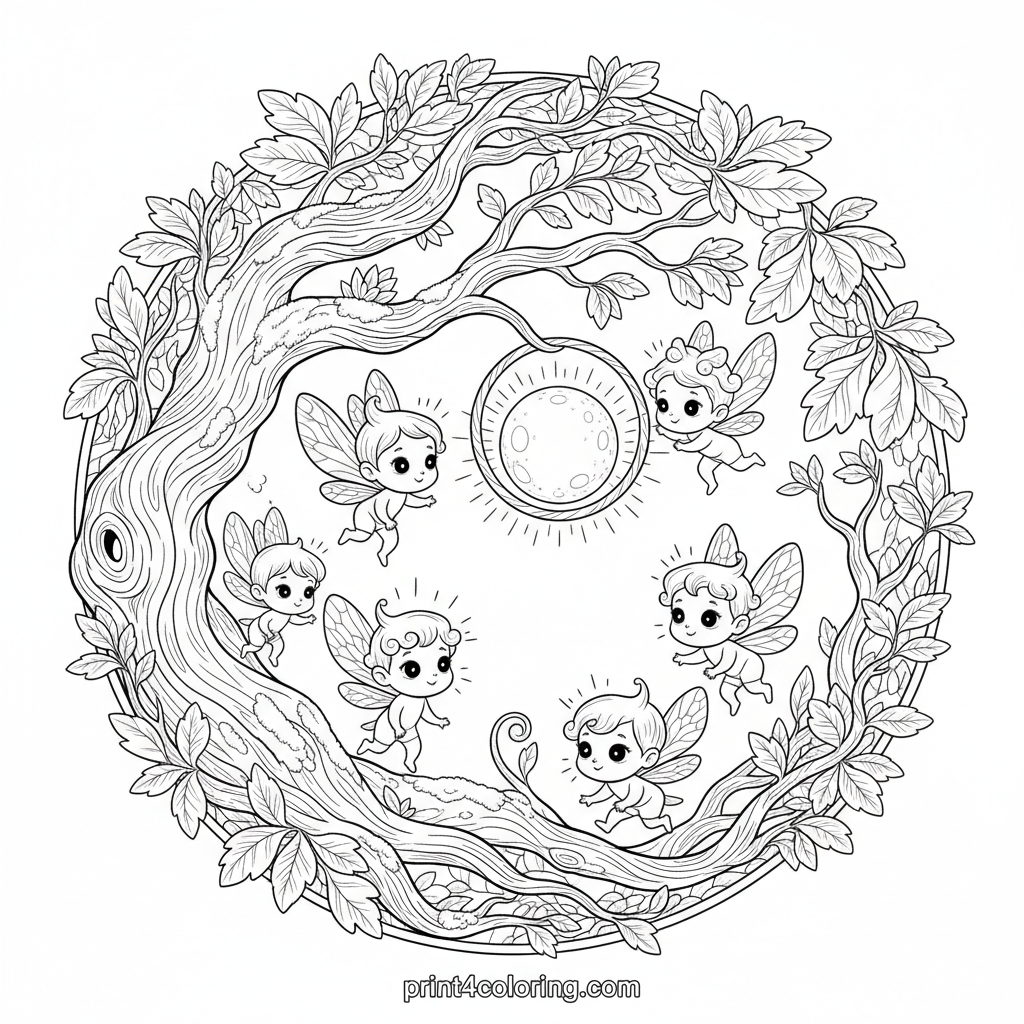 Step into an ancient, magical forest! Tiny, ethereal sprites with shimmering wings are playing their favorite game, gently guiding a soft, luminous 'moon-ball'. Watch them aim for a natural hoop in the gnarled branches of a majestic, moss-covered oak tree. A cozy, enchanting scene waiting for your colors!