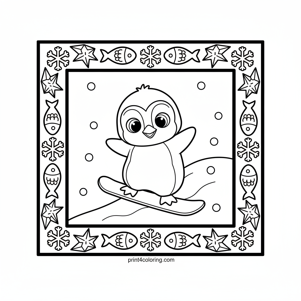 Join our charming baby penguin on its very first snowboarding adventure! With big, curious eyes and a wobbly stance, this little explorer is trying its best to balance on a gentle snowy hill. Watch as it navigates the frosty slopes with a happy heart, ready for a fun day in the snow. Grab your crayons and add vibrant colors to this delightful winter scene!