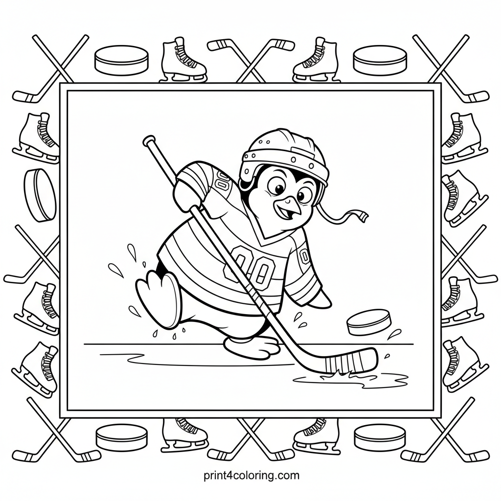 Join our determined penguin on a hilarious hockey adventure! Watch as this clumsy character, in an oversized jersey and tiny helmet, tries to master the puck on slippery ice. Can you help color its comical concentration as it waddles towards its goofy goal? Get ready for some icy fun!
