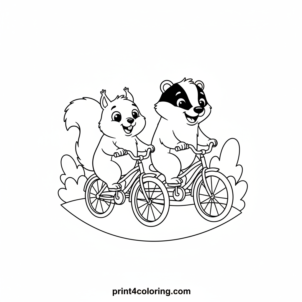 Join a hilarious squirrel and a happy badger as they embark on a wobbly tandem bicycle adventure through the woods! Watch them pedal with big grins, trying to steer their bike on a silly, fun ride. This cute scene is full of charm and ready for your vibrant colors.