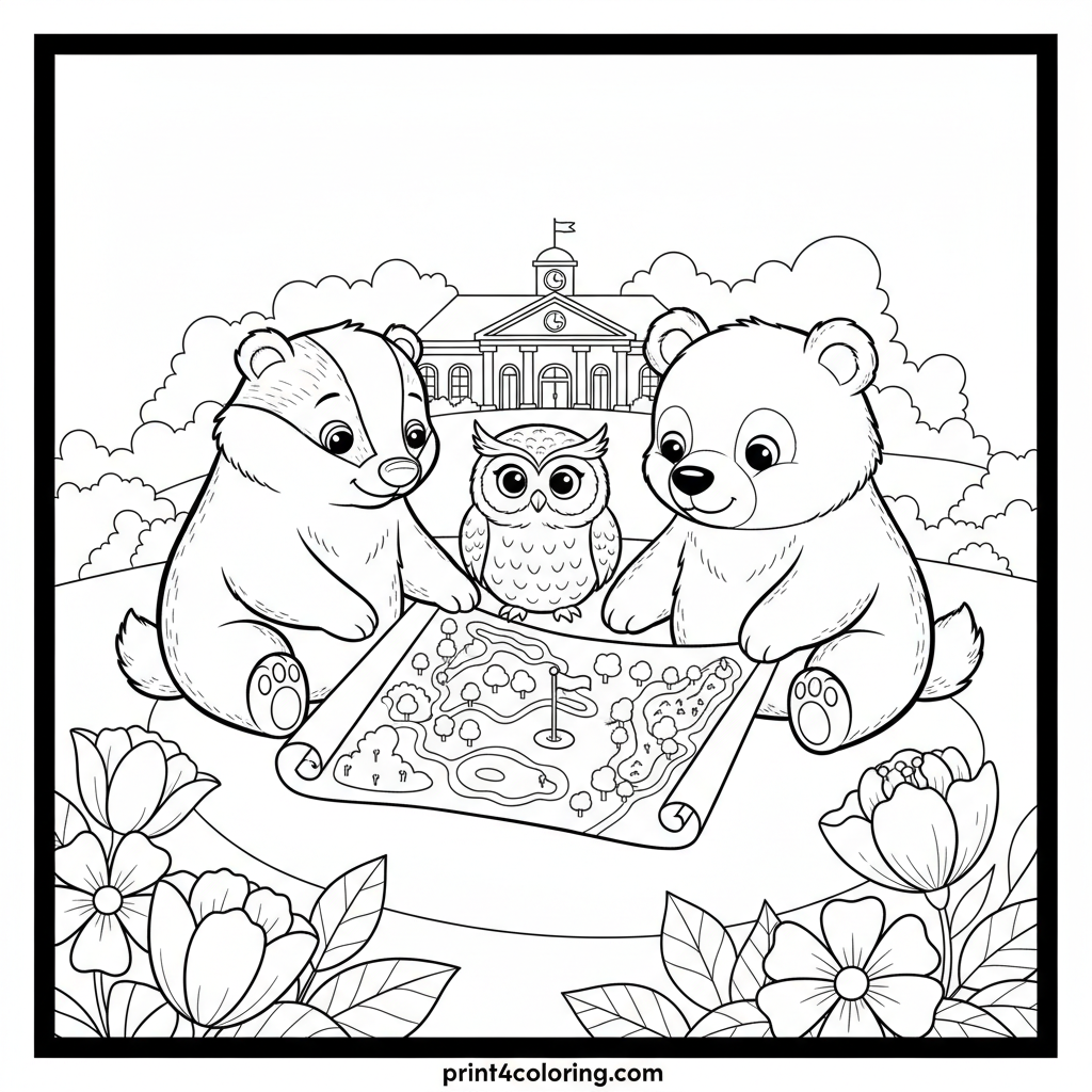 Join a charming badger, wise owl, and friendly bear as they plan their next putt on a beautiful golf course. They're gathered around a detailed map, surrounded by blooming flowers and a grand clubhouse. Bring this cozy scene to life with your favorite colors!
