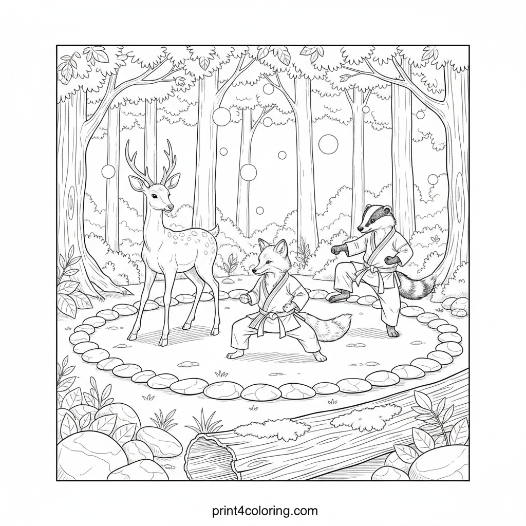 Step into a tranquil forest clearing where friendly woodland creatures gather for a peaceful martial arts lesson. Watch a graceful deer, a focused fox, and a sturdy badger practice gentle karate poses in their tiny gis, learning harmony and discipline under the warm, dappled sunlight. A detailed scene perfect for expert colorists!