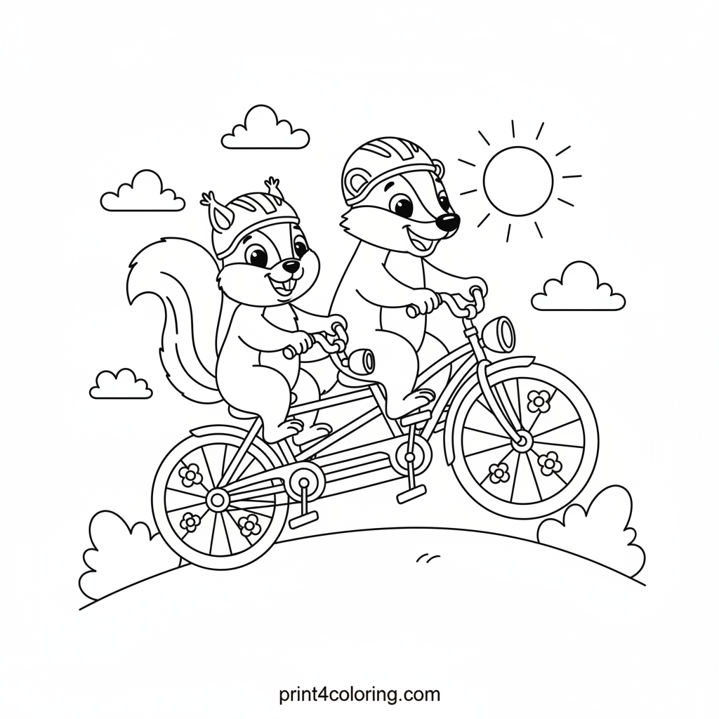 Join a hilarious adventure as a mischievous squirrel and a grumpy-but-happy badger attempt to master a tandem bicycle! Watch them wobble through the woods, smiles wide, ready for a fun-filled ride. This silly scene is perfect for adding your favorite bright colors and bringing their joyful journey to life!