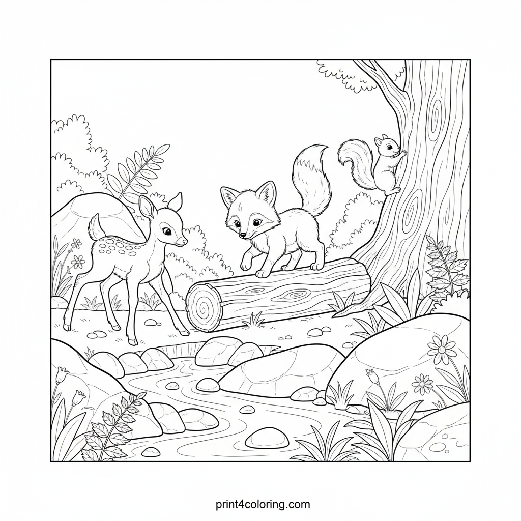 Join a lively fox kit, a graceful baby deer, and a nimble squirrel as they master their forest agility course! Watch the fox balance on a log, the deer leap a stream, and the squirrel climb a tree. This detailed woodland scene is bursting with natural textures and playful challenges for our furry friends. A perfect adventure to color!