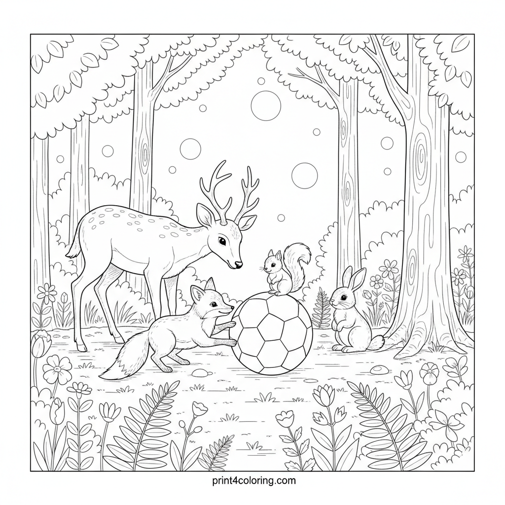 Step into a detailed forest clearing where a curious deer, playful fox, watchful rabbit, and tiny squirrel have found a soccer ball! This intricate scene features anatomically accurate animals with fine fur textures, surrounded by lush ferns, wildflowers, and dappled sunlight. A delightful challenge for expert colorists!