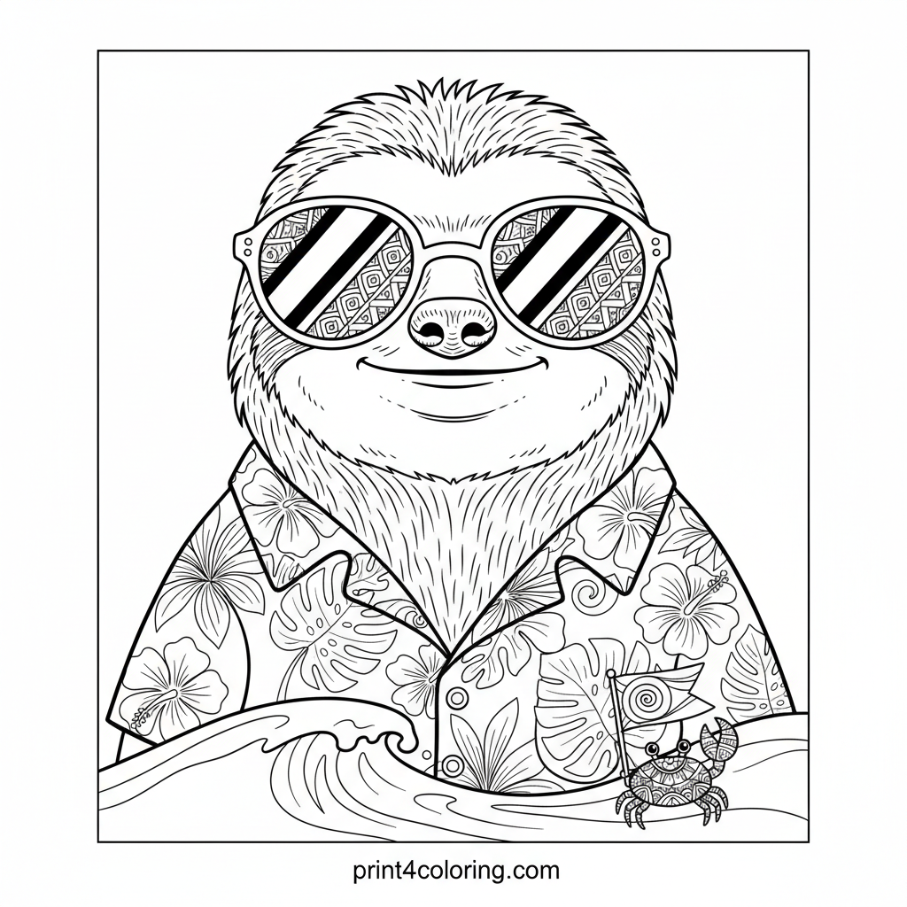 Hang ten with this incredibly chill sloth, perfectly balancing on its surfboard with oversized sunglasses and a cool Hawaiian shirt. Watch as it slowly glides over a detailed wave, while a tiny, curious crab with a patterned shell waves from the sandy shore. Get ready for a super slow, super fun coloring adventure!