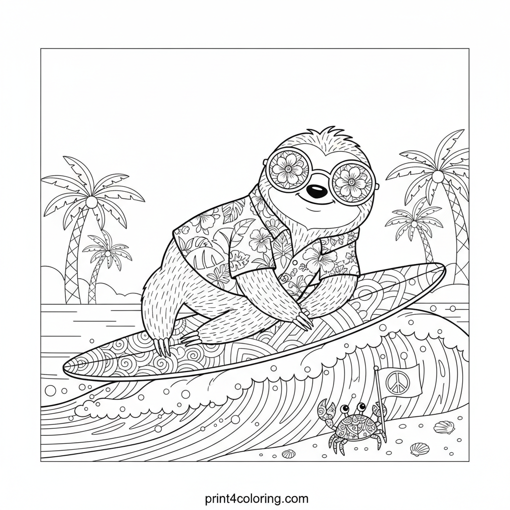 Dive into a world of chill with our surfing sloth! This laid-back dude wears cool oversized sunglasses and a vibrant Hawaiian shirt, expertly balancing on an extra-long surfboard. Watch as it gracefully glides on a perfectly formed, detailed wave, while a tiny crab with cool zentangle patterns cheers from the sandy shore. A truly unique and fun scene!