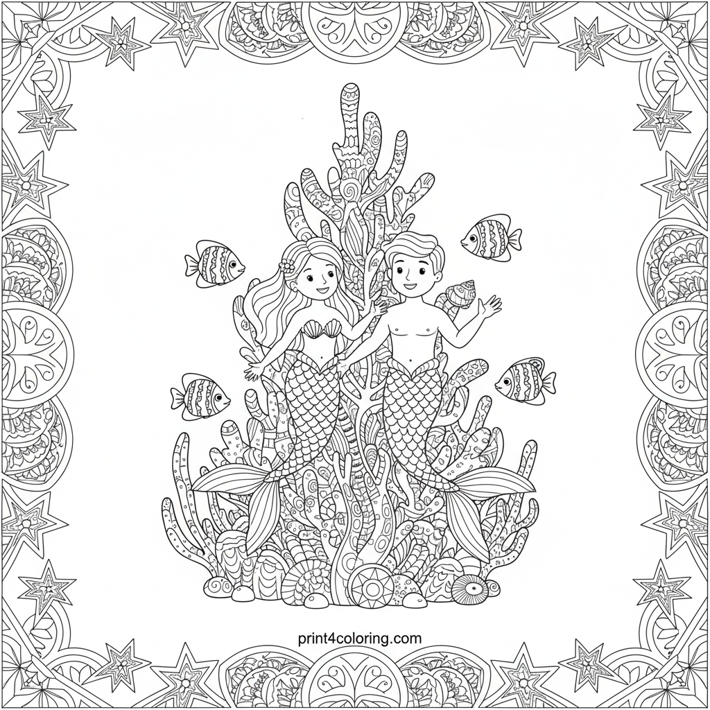 Dive into an underwater adventure with a brave mermaid and merman! They are exploring a stunning, ancient coral reef filled with intricate zentangle patterns. Watch as playful fish with unique designs swim around, cheering them on. This detailed scene invites you to bring the vibrant ocean to life with your colors.