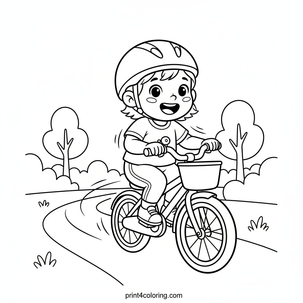 Get ready for an exciting ride! A cheerful child, helmet on and activewear ready, energetically pedals a bicycle down a winding park path. Blurred trees and bushes in the background suggest speed and adventure. Grab your crayons and bring this lively park scene to life with vibrant colors!