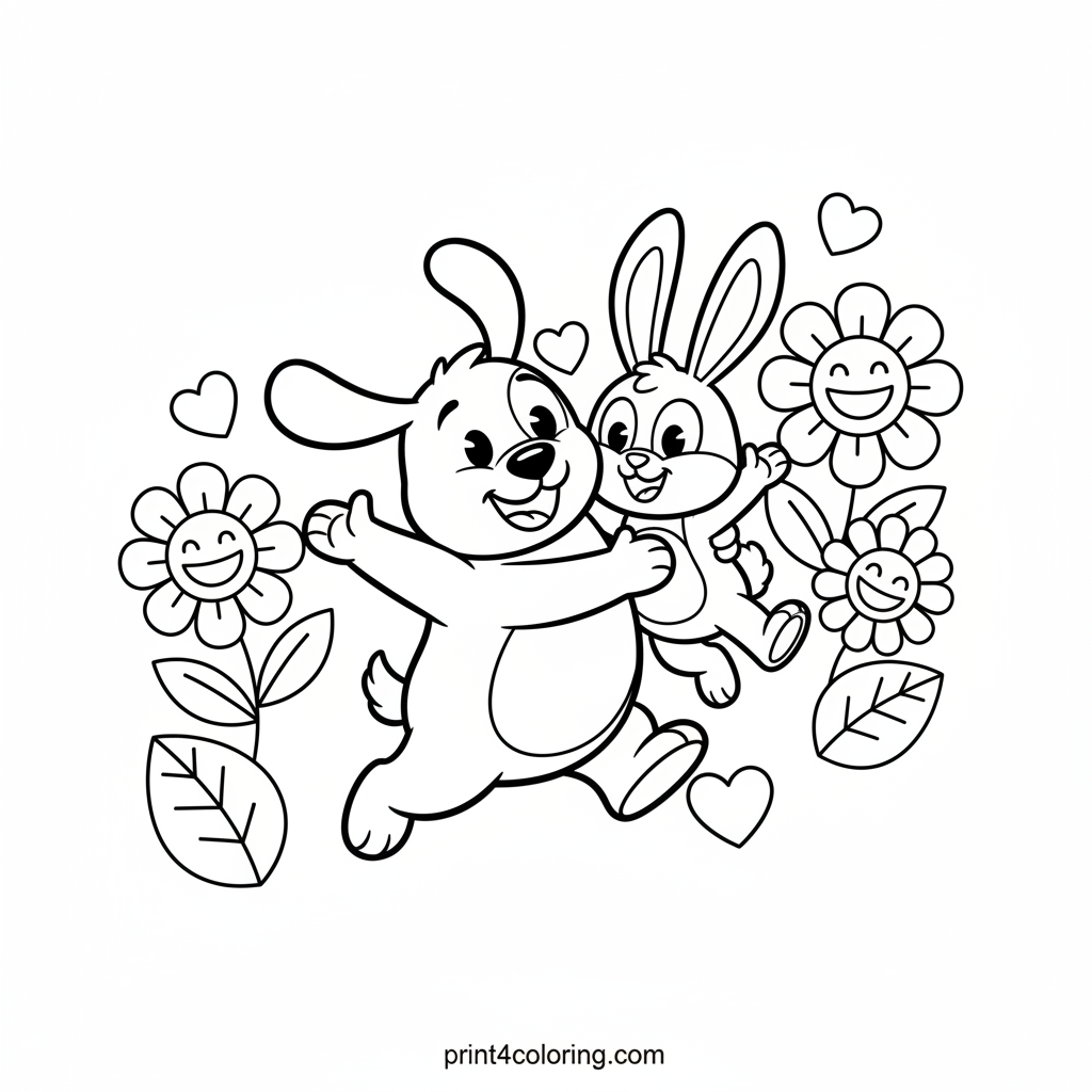 Join Bingo and Floppy for a delightful dance party in their sunny garden! Watch as Bingo holds Floppy, and they move together in a happy, synchronized jig. Surrounded by simple, smiling flowers, this page captures pure joy and friendship. Grab your colors and bring their cheerful garden party to life with vibrant hues!