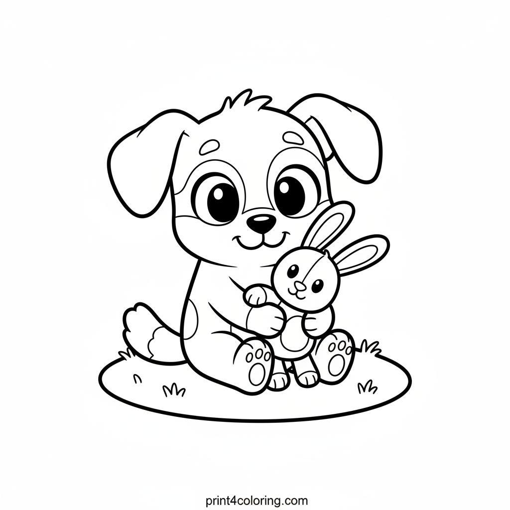 Join Bingo as she shares a heartwarming hug with her favorite toy bunny, Floppy! With big, happy eyes, Bingo holds Floppy close on a soft patch of grass. This sweet scene captures a moment of pure friendship and gentle affection, perfect for young artists to bring to life with their favorite colors.