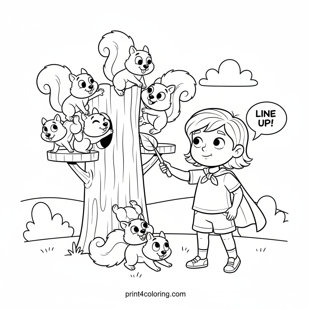 Join Blossom as she hilariously attempts to train a squad of giggling squirrels in superhero moves! Watch as these furry friends climb, tumble, and play instead of following instructions, creating a wonderfully chaotic and adorable scene. Perfect for a fun coloring adventure!