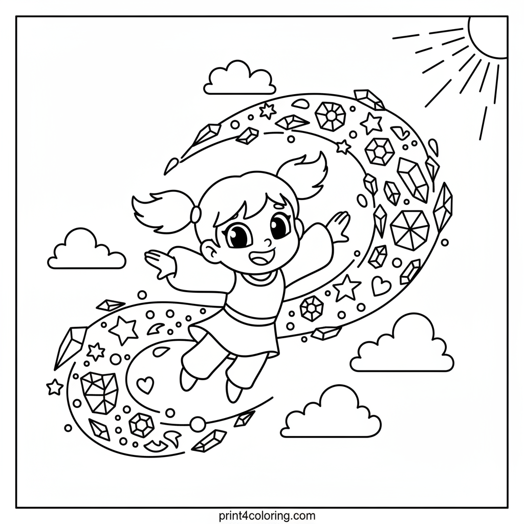 Join Blossom on an exciting adventure as she soars through the sky at incredible speed! Watch as she leaves a magnificent trail of sparkling ice crystals swirling behind her, forming playful frosty shapes. This dynamic scene invites you to add vibrant colors to Blossom's magical journey and the shimmering icy patterns she creates.