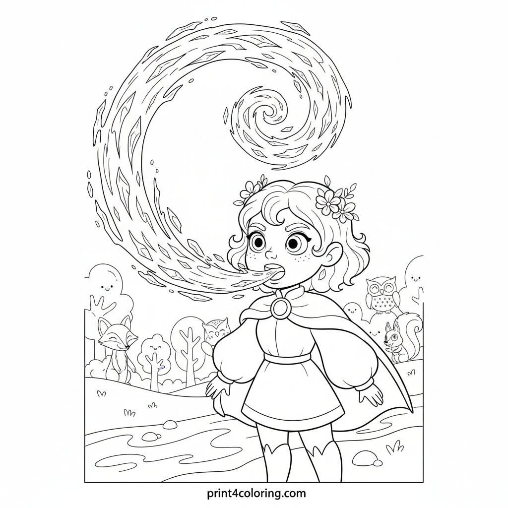 Join Blossom as she heroically conjures a magnificent, sparkling ice bridge with her powerful ice breath! This close-up scene shows her magical feat over a whimsical river, leading to an enchanted forest where friendly creatures await. Bring this wondrous, frosty adventure to life with your favorite colors!