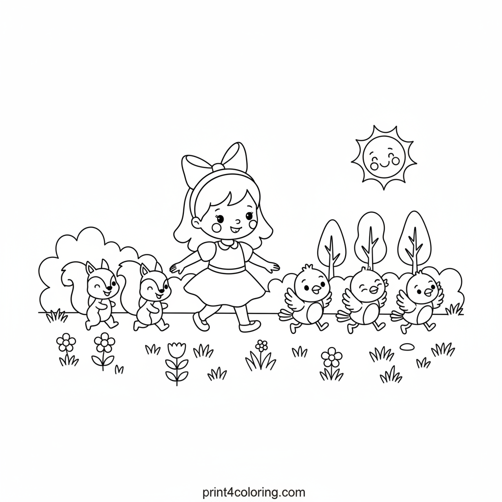 Join Blossom, with her lovely pink bow, as she leads a delightful parade through a sunlit meadow! Tiny smiling squirrels, happy birds, and other forest friends follow along, making this a truly cheerful scene. Bring this heartwarming forest adventure to life with your brightest colors and imagination.