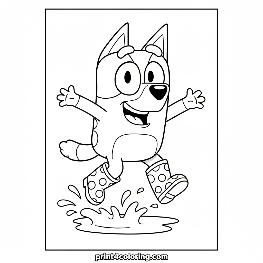 Join Bluey for some splashy fun! This coloring page captures Bluey mid-air with a huge, silly grin, leaping over a small, happy puddle. Watch the comical water droplets fly as she wears her oversized, polka-dotted rain boots. A perfect scene for giggles and bright colors, inviting children to imagine a playful, rainy day adventure!