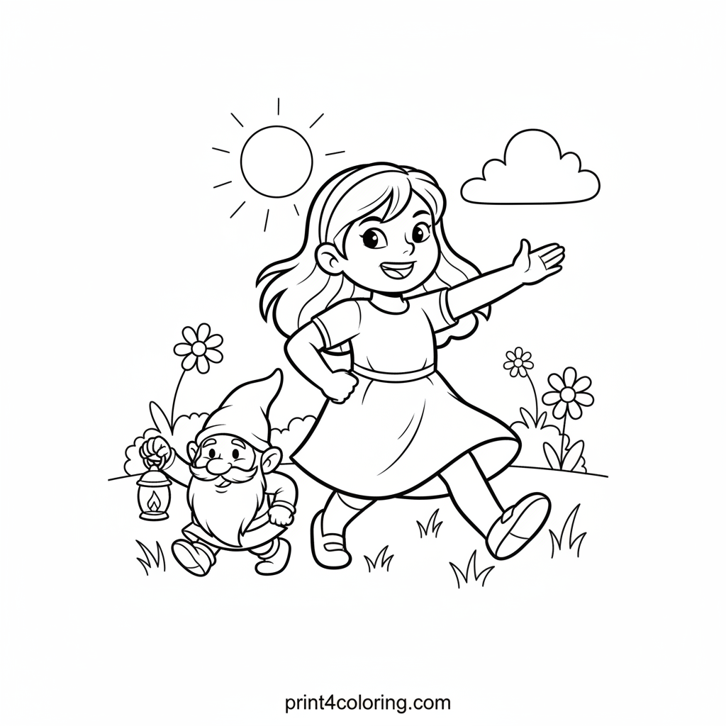 Meet brave Buttercup! In her green dress, she stands proudly with arms crossed, a kind and helpful friend. She's ready to assist her tiny, happy squirrel or friendly magical gnome pal. This heartwarming scene captures the spirit of woodland friendship. Bring it to life with your colors!