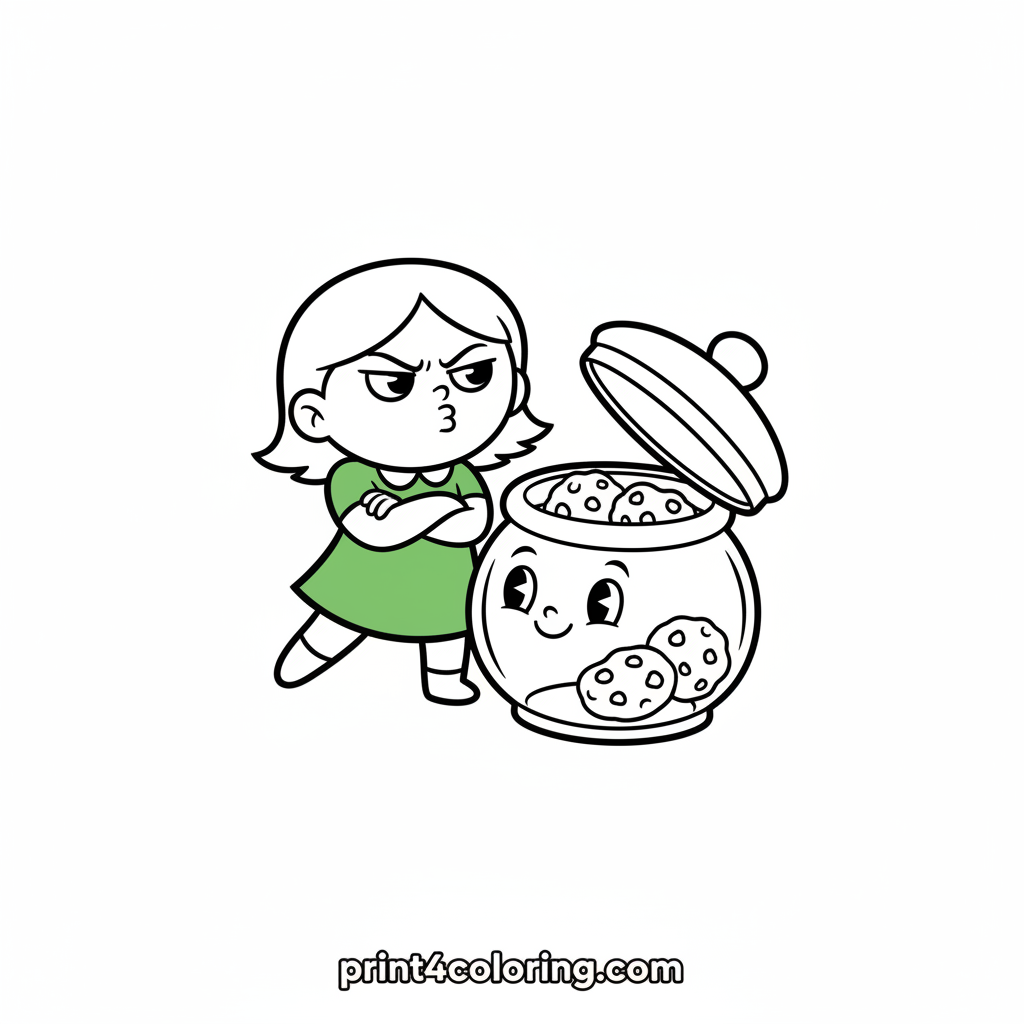 Join Buttercup as she faces her greatest challenge: a giant cookie jar! With her arms crossed and a super funny grumpy face, she's pretending to struggle to open it. Imagine all the delicious cookies waiting inside! This page is full of playful fun and yummy treats, perfect for coloring.