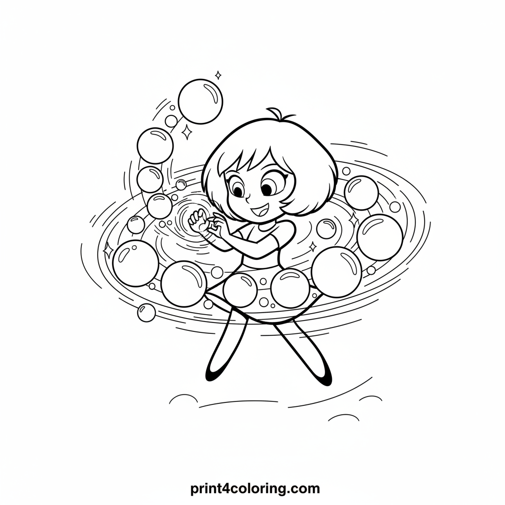 Join Buttercup as she unleashes her amazing bubble powers! With a determined smile and arms crossed, she conjures a spectacular storm of giant, shimmering bubbles all around her. This action-packed scene is ready for you to add vibrant colors to Buttercup's green dress and her magnificent, sparkling bubble blast.