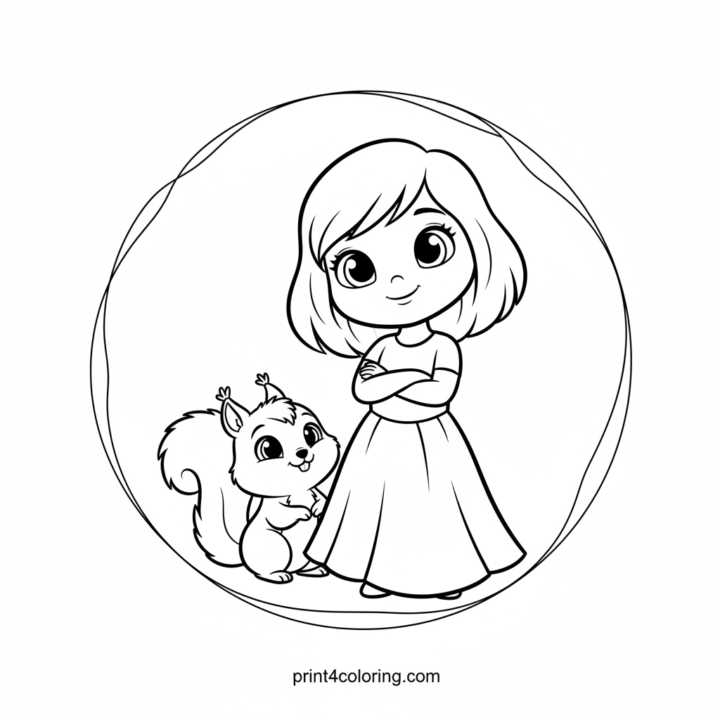 Meet Buttercup, a kind and brave friend, standing proudly in her lovely green dress. With arms crossed, she poses next to her tiny, happy squirrel pal or a friendly magical gnome. This cozy forest scene celebrates friendship and adventure, inviting you to add vibrant colors and bring their heartwarming story to life!