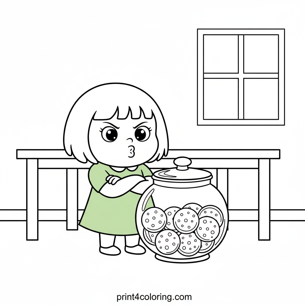 Join Buttercup as she faces her biggest cookie challenge yet! With a hilariously grumpy face and arms crossed, she pretends to struggle with a giant jar overflowing with delicious, yummy cookies. This fun scene captures the playful anticipation of a sweet treat, perfect for young artists to bring to life with their favorite colors.