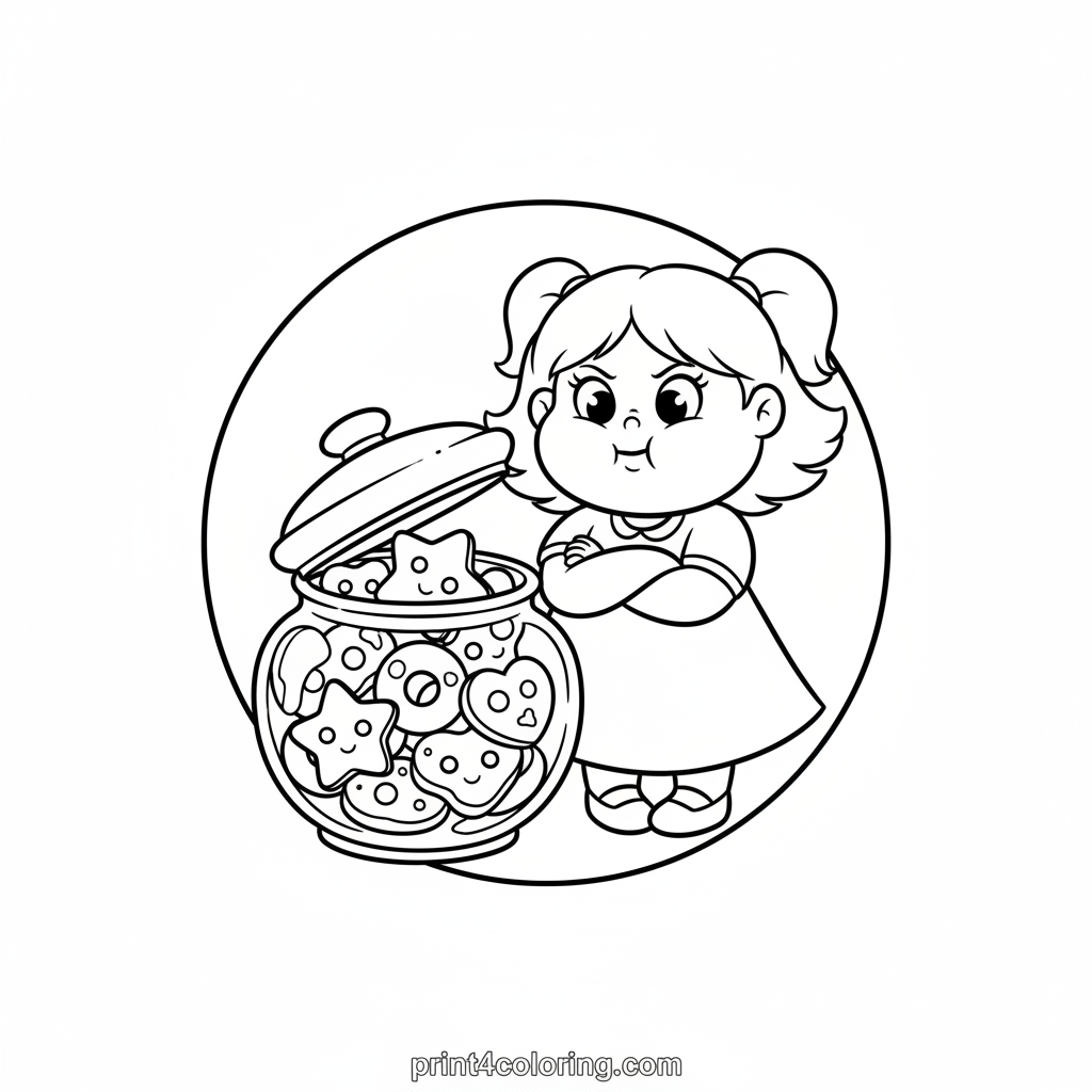 Get ready for Buttercup's cookie challenge! Dressed in her green outfit, she's making a funny, grumpy face, pretending to wrestle with a giant cookie jar. It's overflowing with delicious, sweet treats! Grab your brightest crayons and help Buttercup conquer this yummy quest to enjoy her favorite cookies.
