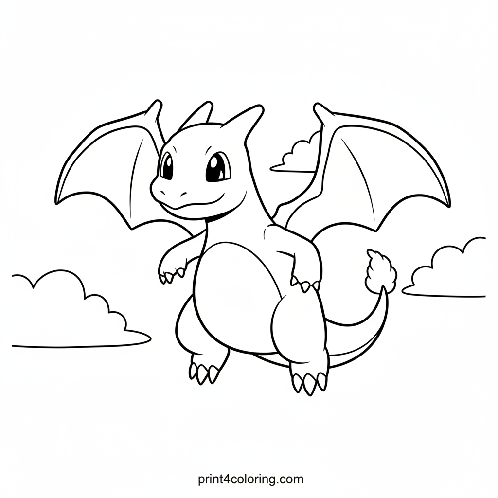 Imagine coloring a magnificent Charizard, both powerful and friendly, as it glides gently through a bright, clear sky. Its strong, wide wings catch the soft breezes. This cozy dragon is on a peaceful journey, inviting you to add vibrant colors to its scales, wings, and the happy sky around it. Get ready for an adventure in the clouds!