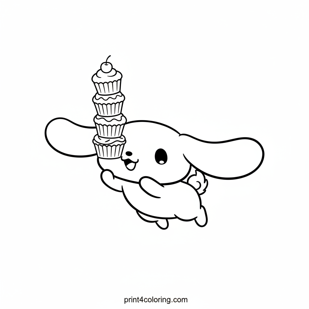 Join Cinnamoroll, the adorable white puppy, on a super silly sky adventure! Watch as he tries to balance a tall stack of colorful, wobbly cupcakes right on his nose while flying through the air. He looks a little clumsy but totally happy, making this a sweet scene to color. Get ready for some high-flying fun!