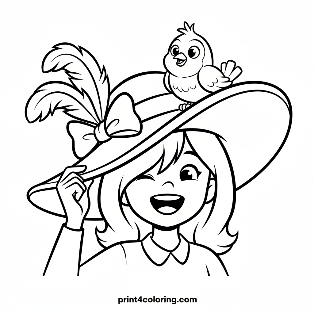 Join Daphne as she giggles with delight, trying to adjust her comically oversized, fancy hat! It's tilted just right, covering one eye in a super funny way. Look closely, a friendly little bird has landed on the brim, looking surprised but happy to be part of the silly fun. Get ready for a colorful adventure!