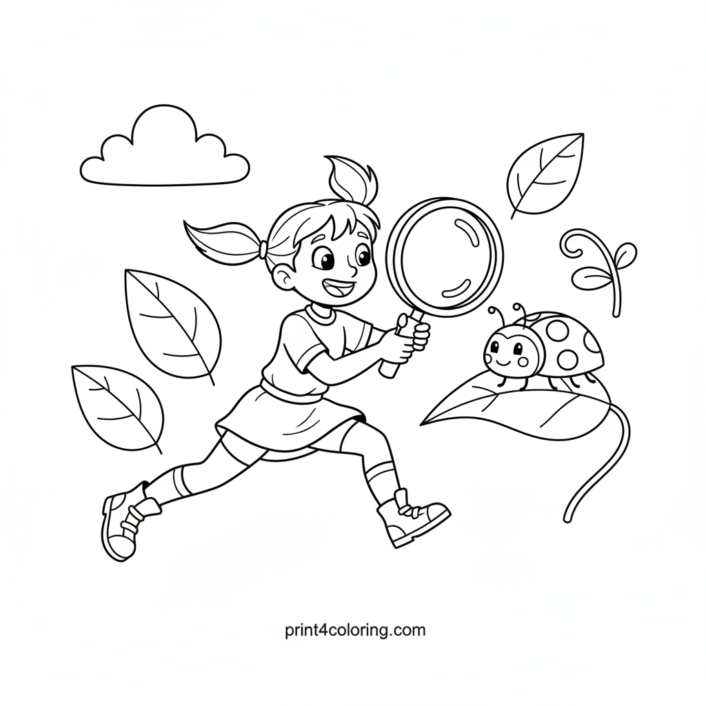 #daphne#garden#magnifying glass#ladybug#discovery#girl#nature#adventure#curious#coloring-page#printable