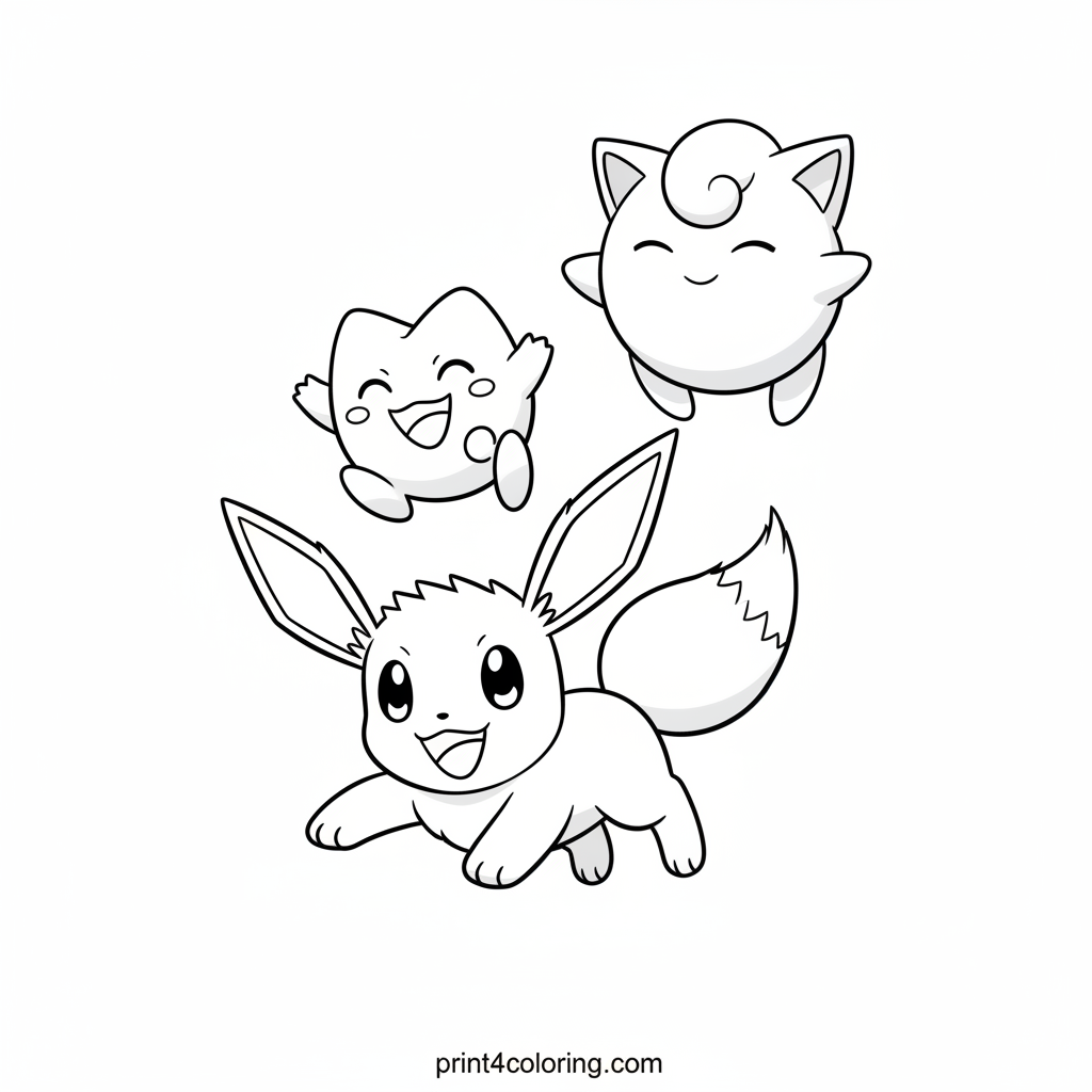Join Eevee as it playfully pounces forward, while a happy Togepi bounces high in the air, full of joy! Behind them, a smiling Jigglypuff floats gently, enjoying the warm sunshine. This delightful scene captures three best pals having an amazing, active day together, perfect for bringing to life with your favorite colors!