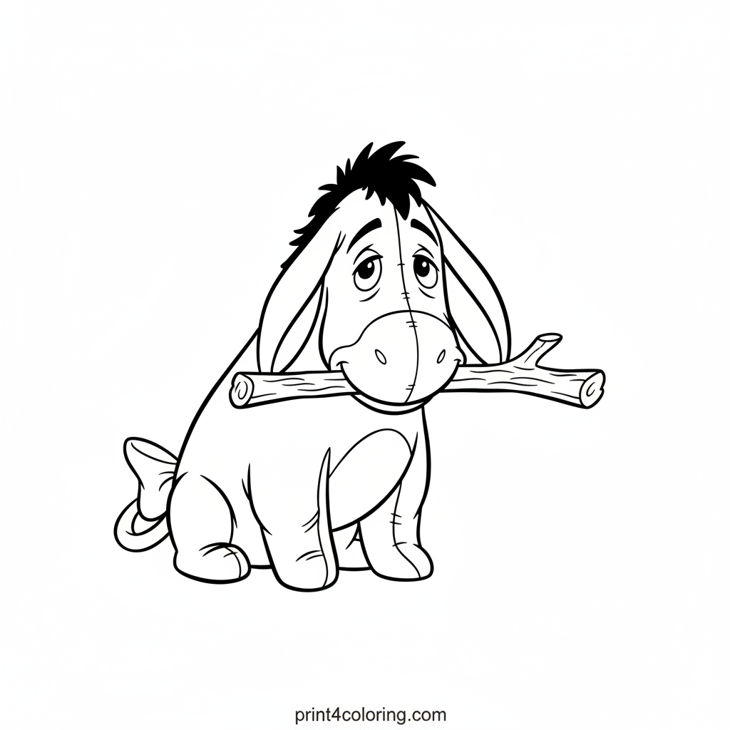 Join Eeyore as he carefully carries a long stick to build his very own cozy home! With his sweet pink bow showing, he takes slow, thoughtful steps, imagining the perfect little house. This charming scene invites you to add vibrant colors to Eeyore's determined efforts and his half-built stick shelter.