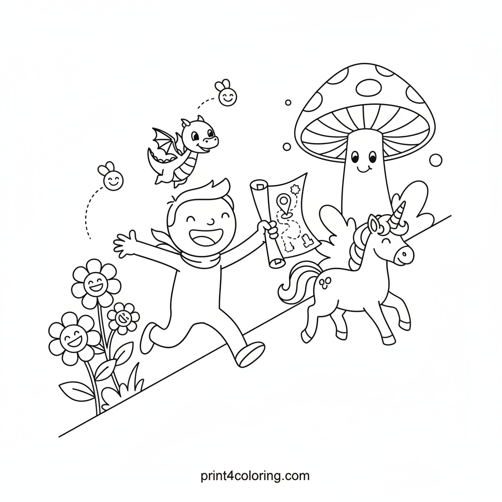 Join Fred, in his stylish ascot, on an exciting quest! He's using a whimsical map to find a sparkling, friendly mushroom. With his tiny dragon and fluffy unicorn friends, Fred explores an enchanted forest filled with giant, smiling flowers and glowing fireflies. Get ready for a magical coloring adventure!