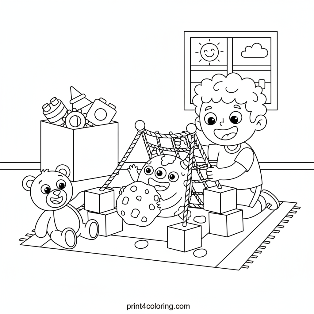 Watch Fred with his big grin as he sets up a clever snack trap! He uses colorful blocks and soft ropes to gently 'catch' a toy monster, lured by a giant cookie. A joyful teddy bear watches the silly scene unfold, adding to the imaginative fun. Get ready to color this heartwarming moment!