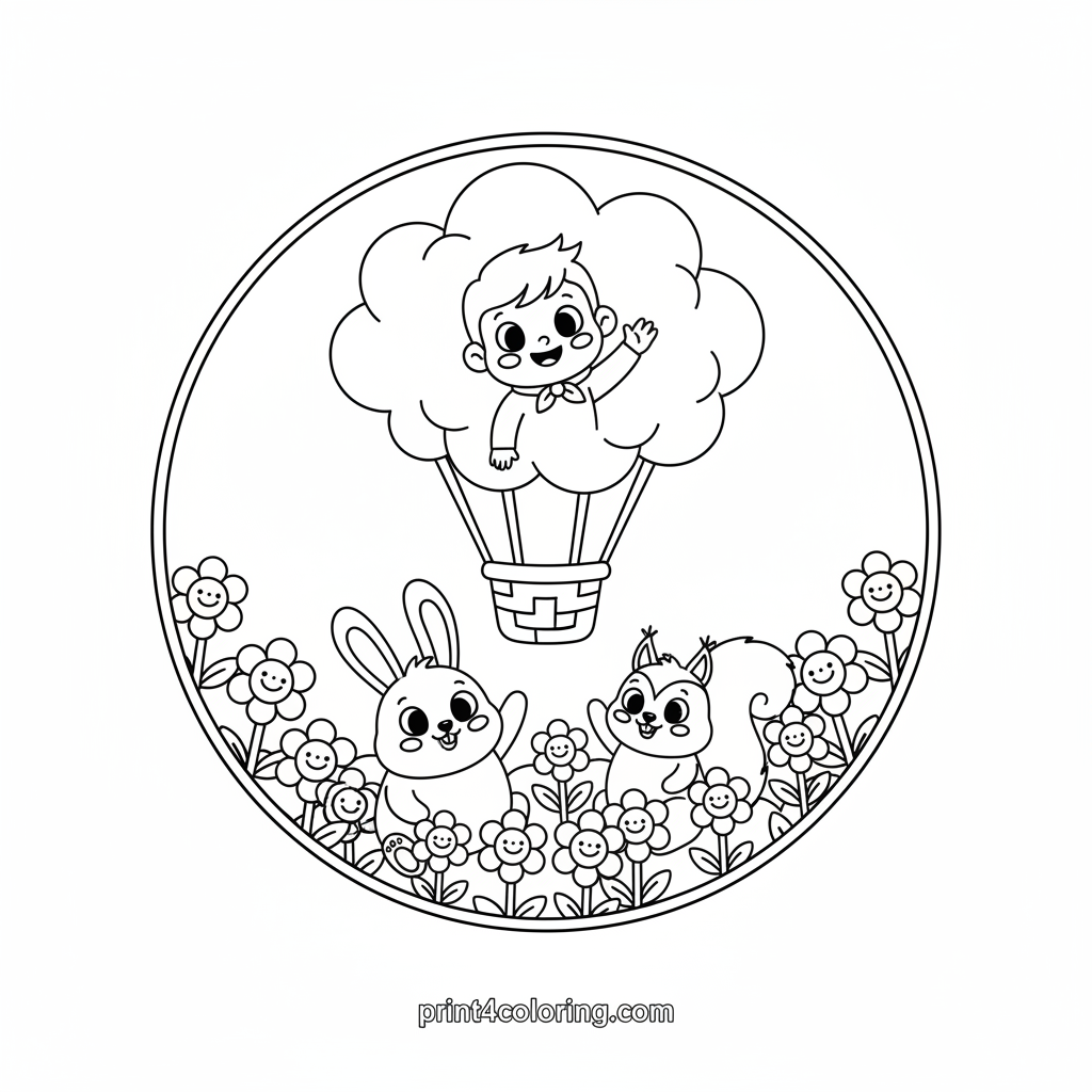 Join Fred on a delightful journey high above the cheerful countryside! He waves happily from his fluffy cloud-shaped hot air balloon, sporting a stylish ascot. Below, a cute bunny and a smiling squirrel wave back from a vibrant field of blooming flowers. This scene is full of joy and friendship, ready for your brightest colors!
