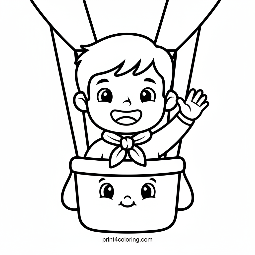 Join Fred on an exciting sky adventure! He waves happily from his friendly cloud-shaped hot air balloon. Below, a cute bunny and a smiling squirrel wave back from a field of cheerful flowers. This easy coloring page is perfect for young artists to bring this joyful scene to life with bright colors and imagination.